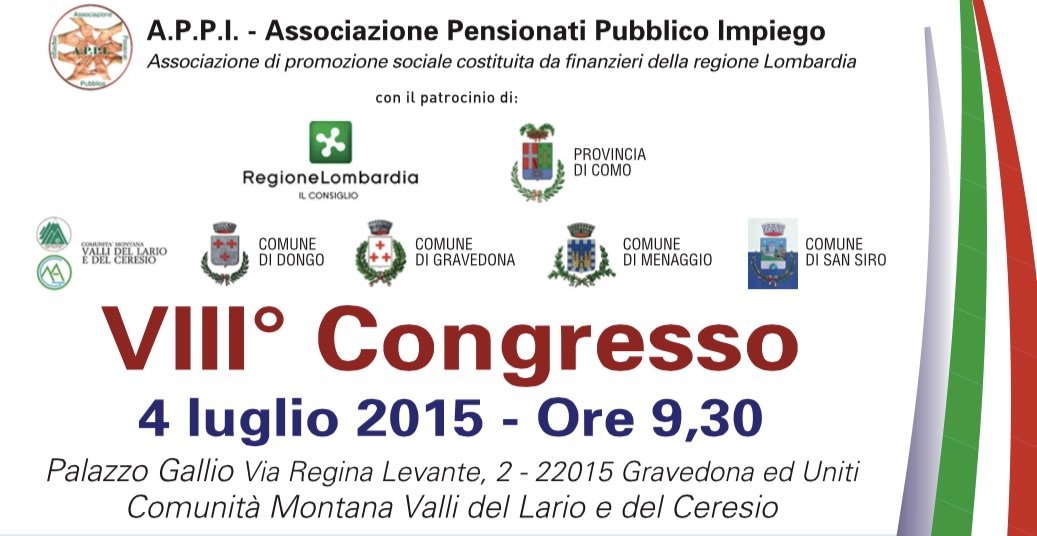 Stimati amici, anche in copia nascosta, vi trasmetto l’allagata locandina /invito all’VIII congresso APPI: Associazione Pensionati Pubblico Impiego, costituita da finanzieri della Regione Lombardia di cui faccio parte in qualità di Consigliere anche se per la pensione mi mancano ancora diversi anni. L’A.P.P.I .una associazione Onlus che si occupa di portare solidarietà, nelle varie forme previste, a persone indigenti, ospedalizzate, diversamente abili, del pubblico impiego in palese stato di difficoltà: https://www.pubblicidipendenti.it/appi/