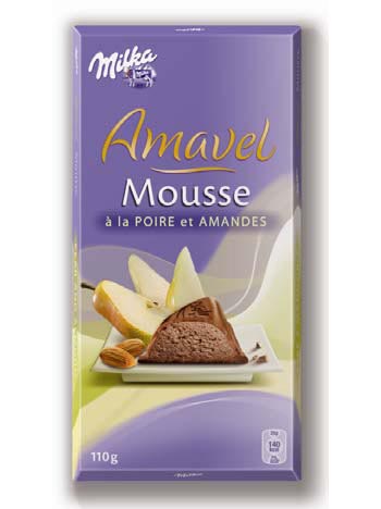 Milka Amavel Pera & Mandorle è una tavoletta di cioccolato al latte con ripieno di mousse al gusto di cioccolato al latte, pera e mandorle.