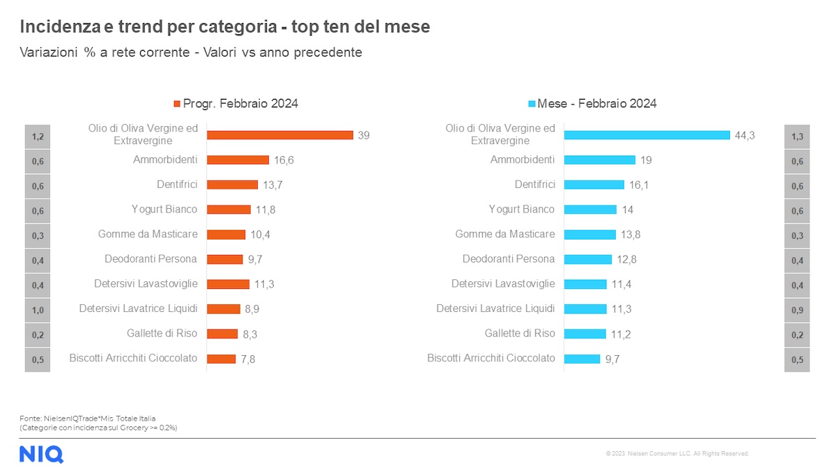 A livello di categorie merceologiche, sul podio della classifica TOP10 di NIQ del mese di febbraio 2024 si classificano l’Olio di Oliva Vergine ed Extravergine (+44,3%), gli Ammorbidenti (+19%) e i Dentifrici (+16,1%).