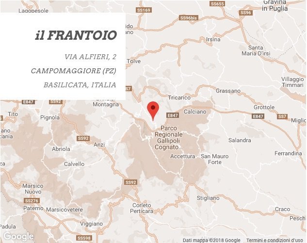 Siamo nel cuore della Basilicata, fra Potenza e Pisticci verso la discesa al mare Ionio, al parco regionale Gallipoli-Cognato verso Oliveto Lucano, per non smentire che il nome è simbolo, dove regnano uliveti secolari della varietà Coratina. Fra i 600 e gli 800 metri di altitudine sul mare, zona climatica E, con gradi totali giorno intorno a 23,50 C° medi che denota anche nelle giornate più calde e siccitose dell’estate mediterranea, una escursione termica diurno/notturna che è ideale per i processi vegetativi e per la maturazione delle olive.
