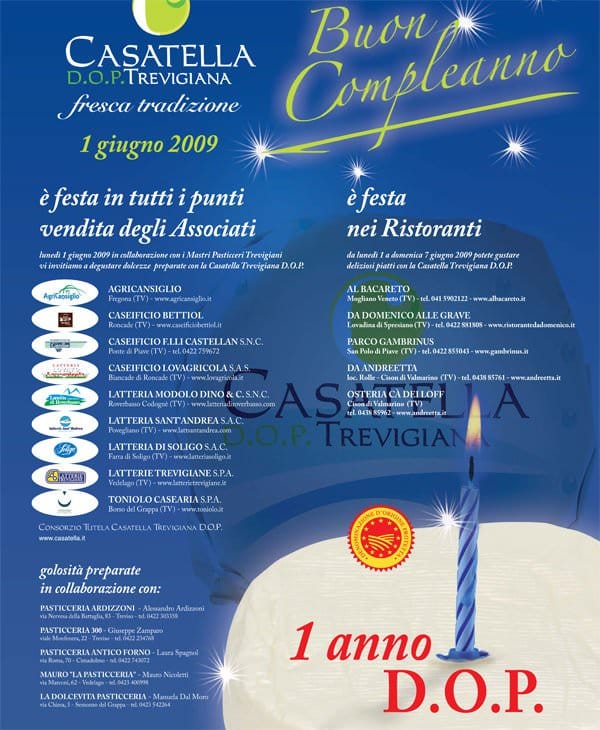 dà le giuste garanzie ai consumatori ed aiuta ad esportare tutto il gusto della trevigianità”. Il programma dei festeggiamenti del primo compleanno della Casatella Trevigiana Dop