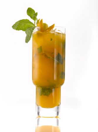 Riempite 10 bicchieri da cocktail con cubetti di ghiaccio, versatevi sopra la mistura preparata, decorate con una fogliolina di menta e servite.