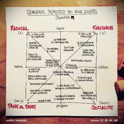 Per capirne di più la cantina Bosco Viticultori di Treviso ha commissionato all’istituto di ricerche di mercato Squadrati di Milano l’analisi di quello che si dice del vino sul web e sui social network, arrivando a sintetizzare i vari atteggiamenti di consumo in quattro profili, rappresentati nel quadrato semiotico.