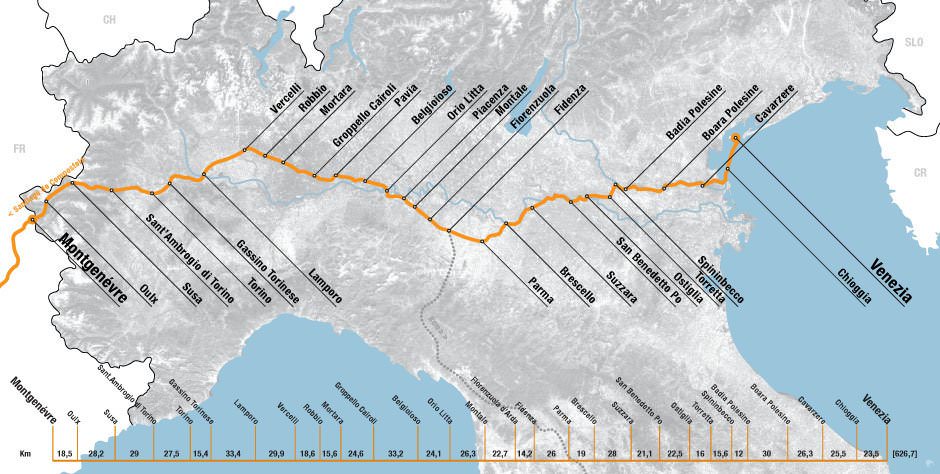 E’ parte di EuroVelo 8. Tutto il percorso si snoda fruendo degli storici e naturali argini, strade sopraelevate rispetto al livello del fiume e dei campi coltivati tutti intorno, costruiti per contenere “ le piene” improvvise che il Grande Fiume ha nel suo dna da sempre. E’ un fiume dalla portata continua elevata grazie a 144 affluenti fra quelli che scendono dalle Alpi e quelli che scorrono verso il fiume da sud, dagli appennini liguri, emiliani, toscani, romagnoli.