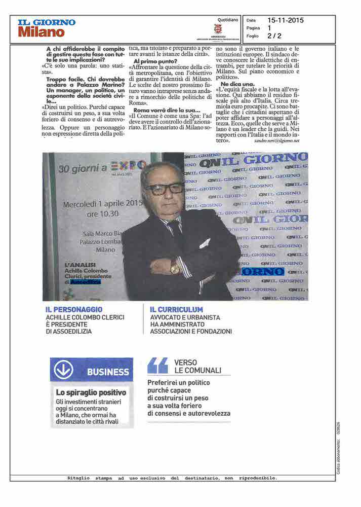 Articolo pubblicato su Il Giorno QN – 15 novembre 2015: intervista del vice Direttore Sandro Neri a Colombo Clerici “A Milano serve un leader per trattare con Roma e l’Europa” – “Ci aspettano 10 anni di responsabilita’ nella guida del Paese”