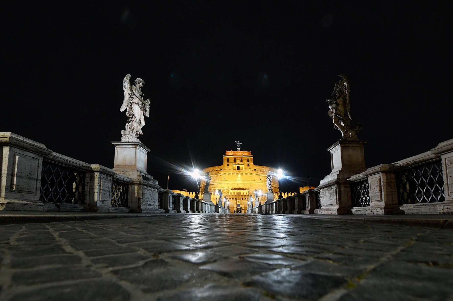 Passando per Ponte Sant’Angelo, ci accoglie lo sguardo austero degli apostoli Pietro e Paolo, santi patroni di Roma. Ai lati ci fanno compagnia nel tragitto, le dieci statue marmoree degli angeli con i simboli della Passione di Cristo in mano. Dall’angolo di via della Conciliazione lo sguardo spazia fino alla piazza vuota del colonnato del Bernini. Al centro l’obelisco in granito rosso si antepone all’austera Basilica di San Pietro, mentre il sole sta ormai tramontando e si cominciano ad accendere le luci. Ci passa accanto un autobus con due passeggeri: forse saranno lavoratori del vicino ospedale che tornano a casa.