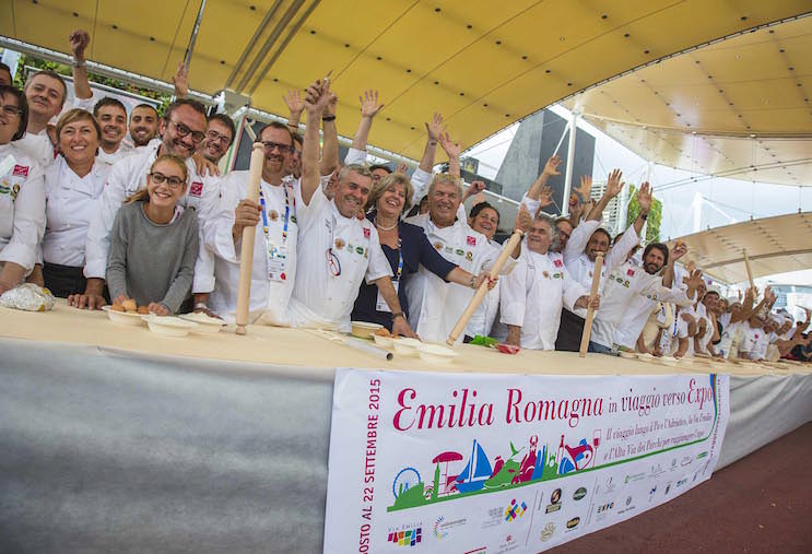 Martedì 22 settembre a EXPO, 35 cuochi di CheftoChef, altrettante Mariette di Casa Artusi e Sfogline emiliane hanno tirato a mano e riempito con 50 ripieni la sfoglia da guinness