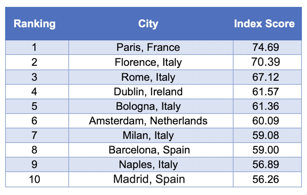 Firenze e Roma, in Italia, seguono rispettivamente al secondo e terzo posto.