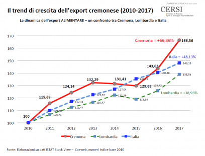 E, nel territorio, emerge il ruolo di Cremona. Secondo il CERSI, è l’undicesima provincia in Italia per valore assoluto dell’export alimentare, terza per la filiera lattiero-casearia e quinta per spinta all’export alimentare.