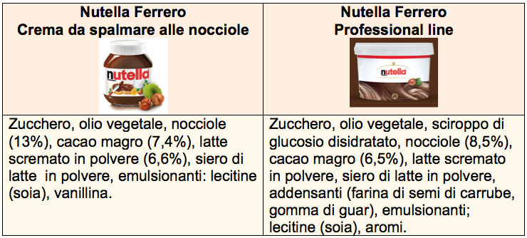 L’elemento critico che accomuna la ricetta del preparato a quella della crema del supermercato è la presenza dell’olio di palma che, dopo lo zucchero, rappresenta il 25% circa del prodotto. Un altro elemento interessante è la riduzione della già scarsa percentuale di nocciole nella crema spalmabile a l’8,5%, e quella del cacao a 6,5%. A proposito dell’olio di palma (da sempre unica materia grassa della Nutella) va detto che si tratta di un ingrediente non utilizzato nelle gelaterie artigianali che preferiscono grassi nobili come panna, burro e burro di cacao.
