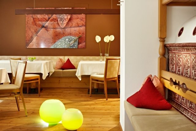 Alla sera la cena da buongustai di cinque portate soddisfa i palati più esigenti: piatti leggeri, delizie della val Pusteria e del Tirolo e della cucina mediterranea, con buffet di insalate e angolo dei formaggi.
