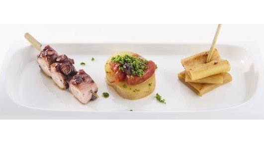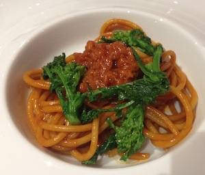 Le Caserecce con peperone di Anglet e baccalà sono un piatto ingannevolmente semplice, che nasconde un arcobaleno di sapori nella cottura della pasta in tre brodi diversamente aromatizzati. Poi le Caserecce con ricci, eucalipto e pepe nero che trasmettono una ieratica emozione. E infine riecco la Carbonara in versione Franck O. Gehry: spaghetti di rapa bianca, tuorlo d’uovo, strisce di pancetta iberica e noce moscata.