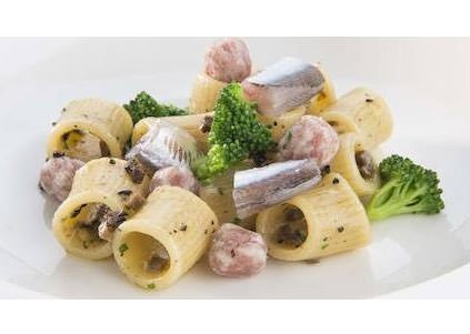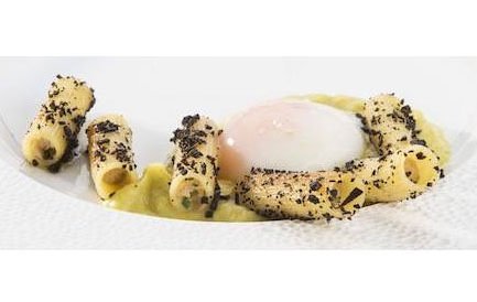 E poi un Fusillone con fegato di seppia, ricci di mare, cicoria frullata e battuto di acetosa, acetosella e rabarbaro, miracolo di equilibrio tra gusti differenti. E un’altra acrobazia, il Mezzo rigatone con alici salate, tartufo nero e ciauscolo (foto). Quando si dice iniziare con il piede giusto.