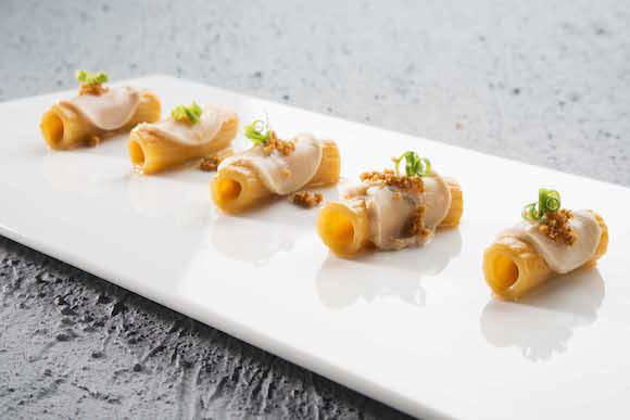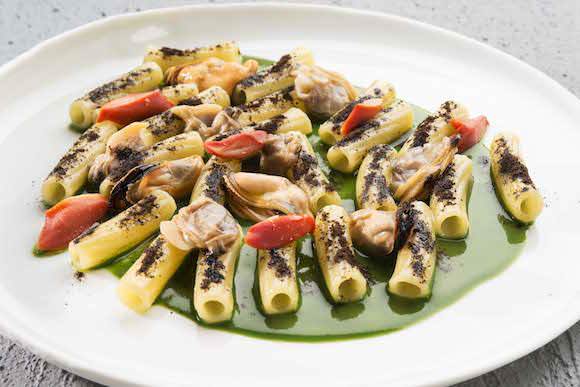 Lo chef cuoce la pasta al 40%, poi la abbatte a meno 30°C e la rigenera direttamente nel sugo di cottura, al momento di servirla: così ha la possibilità di poterne preparare anche molte porzioni, in modo veloce e senza che venga meno il miglior punto di cottura. Propone due piatti che contemplano come ingrediente centrale il porro («Si presta a molte declinazioni»), con esiti che vanno dal delizioso in su. La verdura è ridotta in polvere (arrostita e poi essiccata) e sparsa su rigatoni che reinventano la classica e spesso deludente ricetta “ai frutti di mare”, con cozze, vongole e fasolari fatti aprire direttamente nell’acqua di cottura, più una maionese di prezzemolo ottenuta da una riduzione del brodo di pesce e olio d’arachidi.