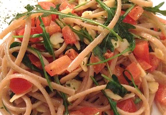 Nella foto il piatto che Roberto non può mai togliere dalla carta, anche ora che non è certo il momento ideale per i pomodori: Linguine di farro Felicetti Bio con pomodoro crudo, rucola e filetti di mandorle. Si fanno mangiare con piacere.