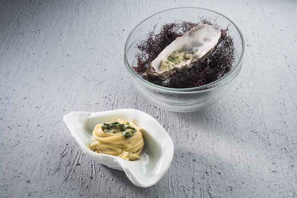 Lui le usa per condire delle linguine con lattuga di mare (ossia l’insalata lattuga fatta marinare otto giorni e disidratare con sale marino, poi in parte cotta nella stessa acqua dove bolle la pasta – diventa dunque un’infusione – e poi tagliata a julienne a guarnire le linguine come fosse un’alga, della quale ha sviluppato sentori e texture; in parte viene invece seccata due giorni con un ventilatore per ricavarne una polvere salata). L’ostrica viene frullata con scalogno, olio e vino per farne una crema che manteca le linguine.