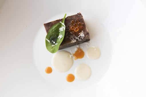 Manzo all’olio, vino bianco, succo di carota, uova di trota e rafano