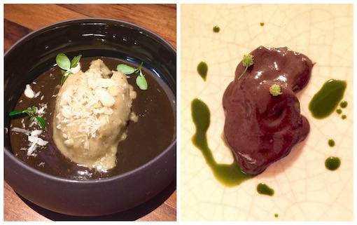 E proprio un dessert ci ha colpito particolarmente, quello che vedete a sinistra nella foto: Finto cioccolato con un gelato all’ananas e rosmarino e noci macadamia sabbiate con la mirra. “Finto cioccolato” perché del cibo degli dei c’era il gusto, non l’ingrediente principale – il cacao – sostituito da mallo di noce, unito a zucchero, fava tonka e uova. Piacevole, cremoso, saporito, con il gelato dolce-acido a fare da contrappunto, l’aromaticità del rosmarino, la croccantezza delle noci macadamia…