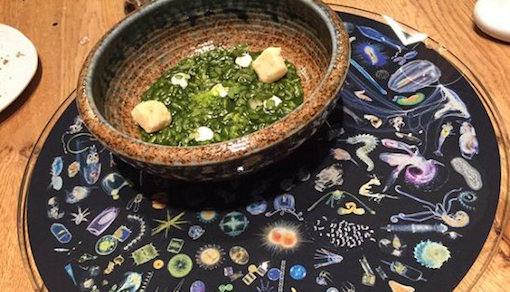 Ma anche il sottopiatto è splendido: «Mi sono innamorata di questa rappresentazione del plancton trovata su Internet. Ho contattato su facebook l’autore, il biologo Christian Sardet, chiedendogli il permesso di utilizzarla. Mi ha risposto con un sì entusiasta». Come il tweet dello stesso Ángel León in risposta al nostro dopo l’assaggio: «emocionante!», ha scritto l’andaluso. Sapori densi, estremi ma anche familiari.