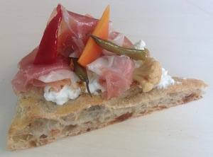 Pizza in teglia con ricotta di bufala, culaccia e giardiniera di verdure in agrodolce