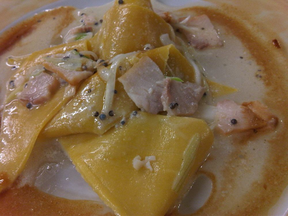 Stracci di pasta fresca con caviale, storione e colatura di cipolle