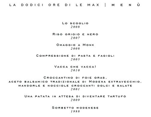 In fb c’è tanto di evento, Il Massimo del Massimo da Massimo, facile da riassumere: tre turni, 12.30 – 15.30 – 20.30, per un menù che è un viaggio nella storia
