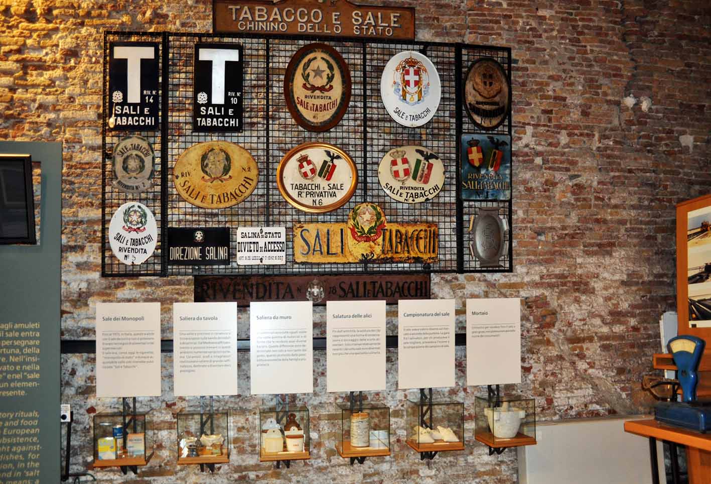 Nel Musa si conservano strumenti da lavoro in uso ai salinari, macchine e apparecchiature, la riproduzione di ambienti di lavoro, il plastico dell’area dei magazzini, la garitta con il finanziere che controllava le operazioni di pesa e che la “corbella” (circa 20 kg di sale), fosse ben piena. Diverse le targhe raccolte dei Monopoli di Stato, foto storiche, documenti. Tutto verte attorno al sale: lo trovi al naturale, ma anche in forma d’opera d’arte. Come il piccolo Presepe in vetrina, o in cristalli, esposto con quello noto di altri luoghi del mondo, come quello rosa dell’Himalaya.