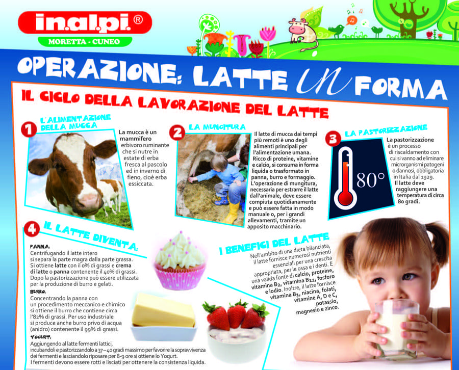 Pensando ai bambini e all’importanza che hanno il latte e i suoi derivati nella loro crescita e sviluppo, In.Al.Pi. ha creato una locandina che presenta in modo chiaro e accattivante tutte le
