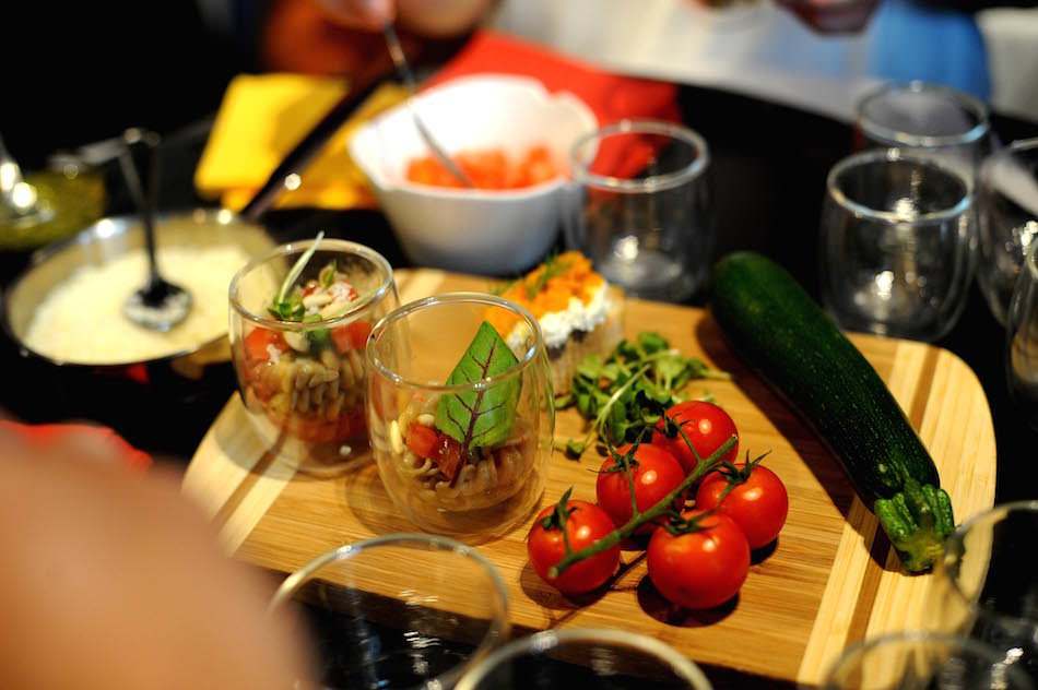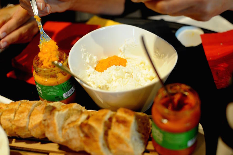 al termine dell’evento si è tenuta una degustazione con una crema spalmabile e una pasta integrale contenenti percentuali di larve di “Tenebrium Molitor”, noto come verme della farina. La crema, nelle due varianti al pomodoro e alle carote e cumino è andata a condire, insieme a morbido formaggio di capra, delle bruschette mentre la pasta, composta al 10% di farina di Tenebrium, è stata servita a crudo con pomodori, pinoli e olio extravergine di oliva umbro.