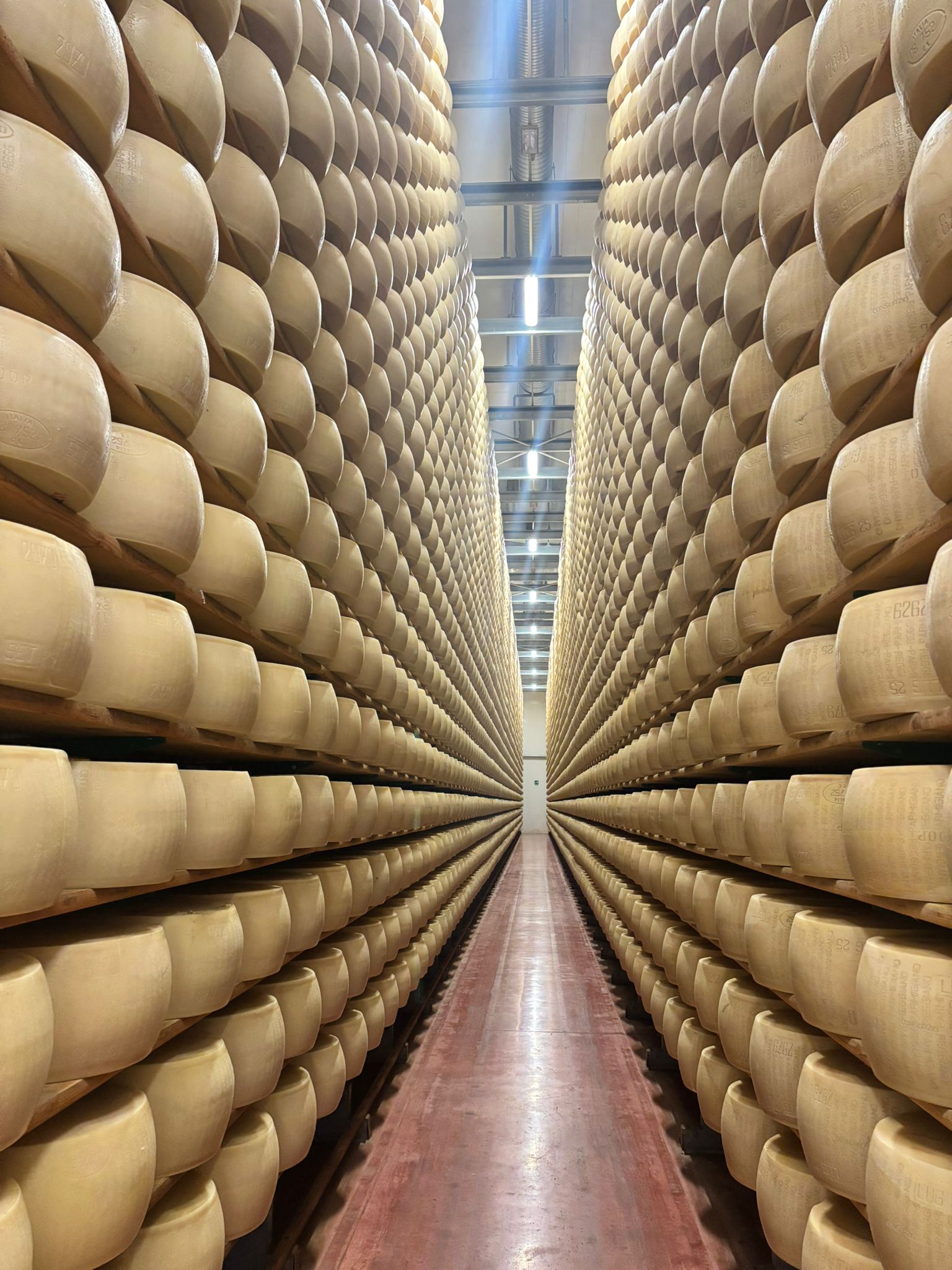 Una sala imponente, dove migliaia di forme dorate riposano in file ordinate fino a perdersi nella profondità del silenzio. Le luci filtrano morbide tra le scaffalature, accarezzando le superfici lisce dei formaggi. Si cammina lentamente, quasi in punta di piedi, come davanti a un’opera d’arte. E in fondo, lo è davvero.
