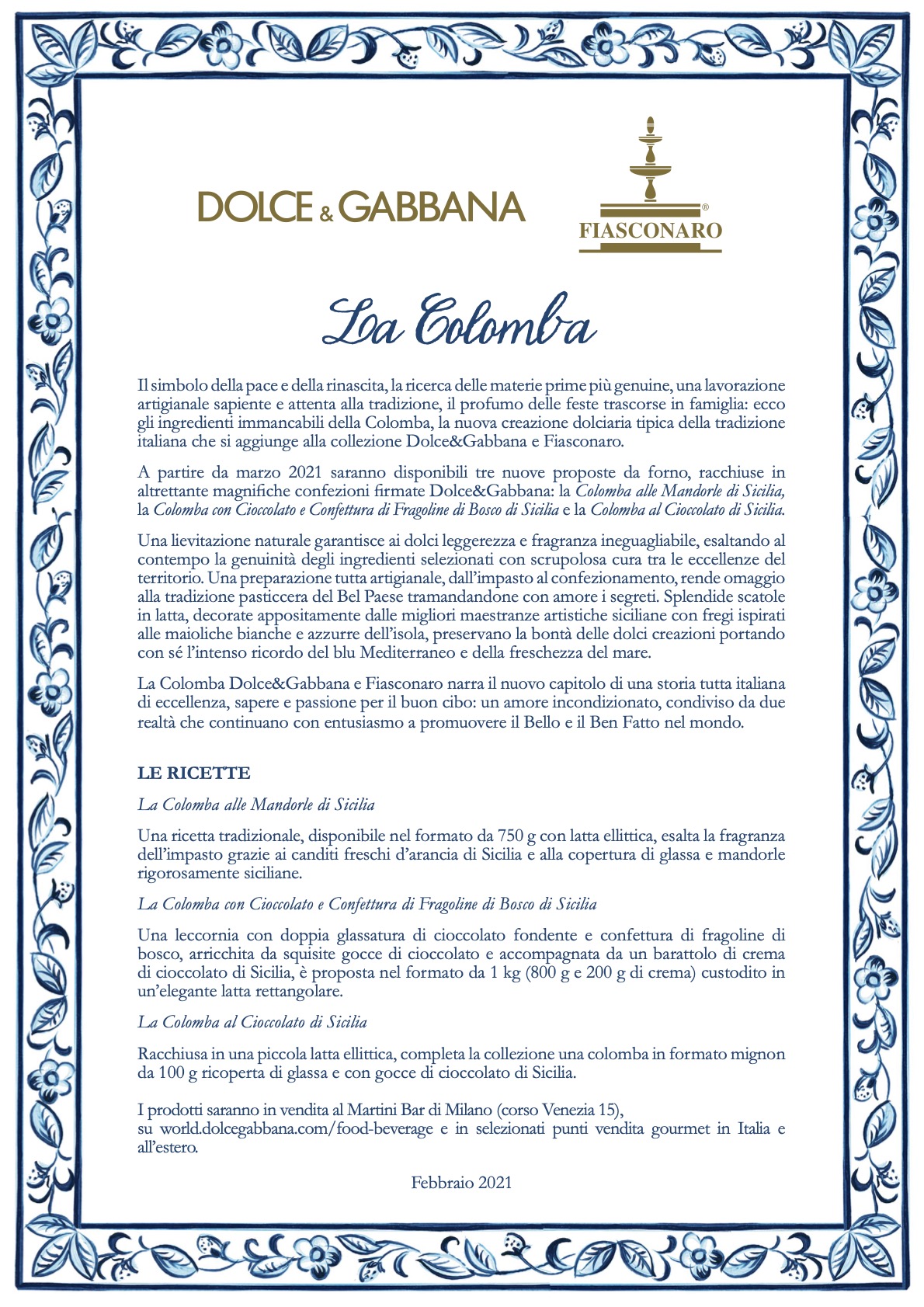 “La Colomba”, la nuova creazione dolciaria tipica della tradizione italiana che si aggiunge alla Collezione Dolce&Gabbana e Fiasconaro. Il nuovo capitolo di una storia tutta italiana di eccellenza, sapere e passione per il buon cibo, condiviso da due realtà che continuano con entusiasmo a promuovere il Bello e il Ben Fatto nel mondo.