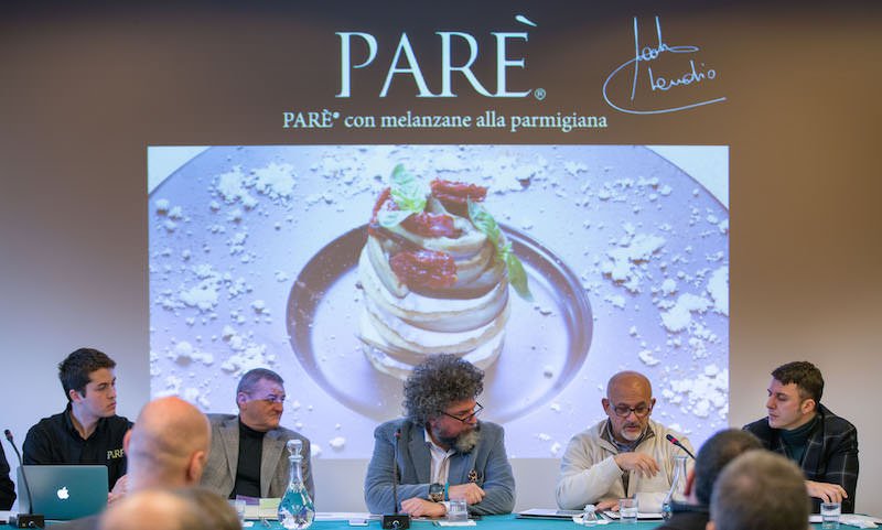 ”Claudio Sadler, chef di fama internazionale 2 stelle Michelin, rilegge l’esclusivo snack alla luce della grande tradizione culinaria italiana, pensando alcuni suggerimenti che potranno incuriosire il neofita o lo chef professionista: un semifreddo di Parmigiano chiuso fra due croccanti di Parè; una Parmigiana di melanzane con una torretta di ricotta, mozzarella, pomodoro candito e basilico; una bagna caoda spumeggiante, acciughe, peperoni arrostiti, con salsiccia di Brà avvolta con semi di sesamo neri; e per finire, una ricotta con tartufo, uova di quaglia, asparagi e Parmigiano”. Dopo l’importante debutto al Cibus di Parma, e la presenza nei punti Eataly, Parè si appresta a sbarcare a TuttoFood Milano in contemporanea con Expo 2015, il prossimo mese di maggio.