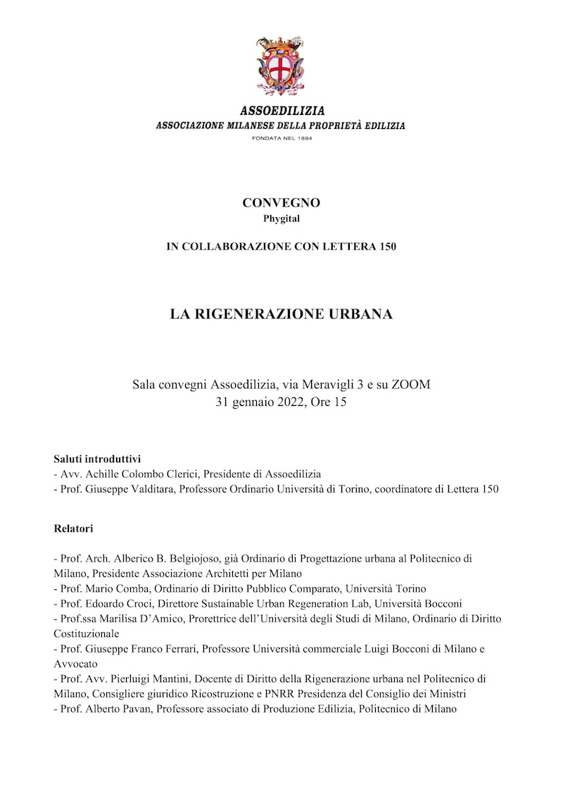 Per chi fosse interessato a seguire l’intero dibattito, si trasmette il link del convegno phygital Assoedilizia, in collaborazione con Lettera 150, tenutosi ieri 31 gennaio 2022, sul tema “LA RIGENERAZIONE URBANA” : https://www.youtube.com/watch?v=uxfrgD39GVI
