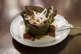 “Cerco di trovare nel mio territorio -San Marino è “marca di confine” per eccellenza con la sua collocazione tra Romagna e Montefeltro- quanto di meglio ci offrono i nostri produttori ma senza vivere l’ansia del Km zero a tutti costi – continua Sartini – per esempio su un uovo a bassa temperatura di un allevamento avicolo del monte Titano, utilizzo un formaggio “bagoss” d’alpeggio che un po’ di strada la fa prima di completare questa ricetta. Però si sposa molto bene con gli asparagi dell’orto e una crema di ceci di San Sisto, un piccolo paese del Montefeltro a mezz’ora d’auto dal ristorante.”