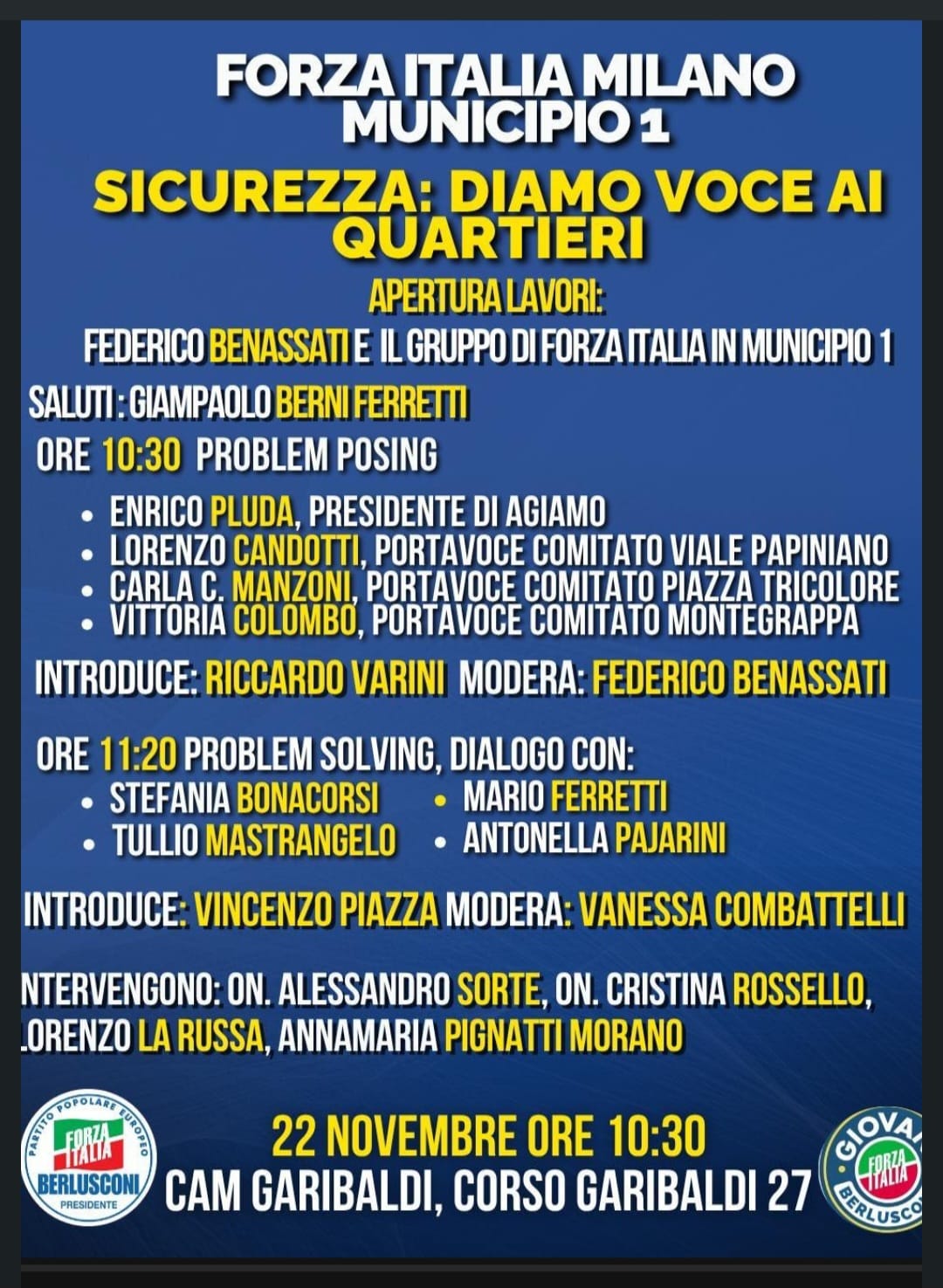 I saluti iniziali saranno portati da Giampaolo Berni Ferretti, consigliere di Fi al Municipio 1, che punta il dito contro la Giunta Sala per la gestione fallimentare della sicurezza in Corso Como e nelle aree limitrofe: “Il Consorzio Corso Como, nato anni fa come esperimento di sicurezza partecipata tra commercianti e istituzioni, è oggi in liquidazione. Un fallimento che certifica l’abbandono di un’intera zona da parte dell’amministrazione comunale”.