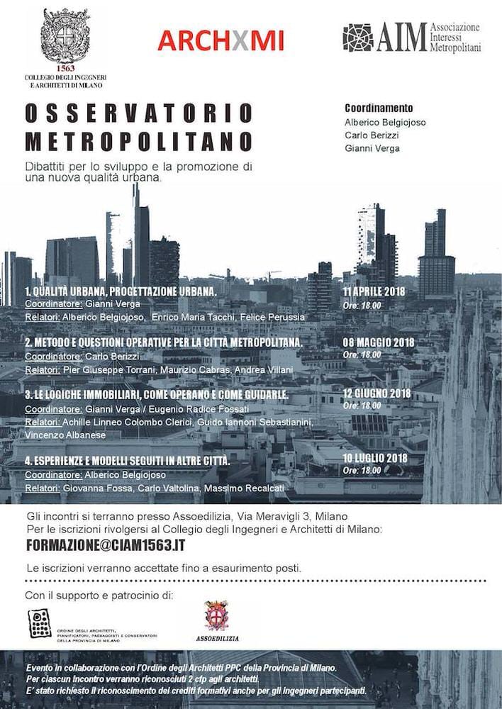 Il Collegio degli Ingegneri e Architetti di Milano, l’Associazione Architetti per Milano e AIM – Associazione Interessi Metropolitani – promuovono il ciclo di incontri “Osservatorio Metropolitano – Dibattiti per lo sviluppo e la promozione di una nuova Qualità Urbana”, finalizzato ad approfondire le diverse questioni che stanno alla base delle future proposte sullo sviluppo di Milano e della sua Area Metropolitana attraverso il coinvolgimento di relatori esperti e riferiti ad un ampio quadro multidisciplinare. Coordinamento: Alberico Belgiojoso, Carlo Berizzi, Gianni Verga.