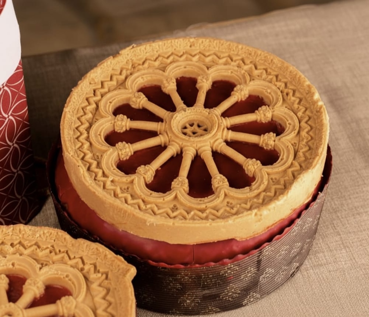 Perché ogni creazione del Maestro Giotti nasce da una ricerca meticolosa sulla tradizione pugliese, reinterpretata attraverso tecniche avanzate e una sensibilità estetica che rende riconoscibile il suo stile in tutta Italia. Senza trascurare l’appeal che può apportare qualche novità fuori dall’usuale. Come, appunto, la novità di quest’anno, il Panettone Rosone, un lievitato che unisce arte sacra e arte dolciaria. Sulla superficie, una frolla alle mandorle finemente lavorata riproduce il rosone della Cattedrale di Giovinazzo, trasformando un gesto di devozione architettonica in un simbolo di arte dolciaria. L’impasto è sostenuto dall’olio EVO cultivar Oliarola, che conferisce una luminosità naturale e una struttura alveolata più soffice e persistente. La ricetta integra un bel po’ di prodotti pugliesi come amarene, gelé di ciliegie Ferrovia di Turi, mandorle, vin cotto di fichi e scorza d’arancia: un equilibrio calibrato su densità, acidità e aromaticità che richiama la complessità dei dolci natalizi.