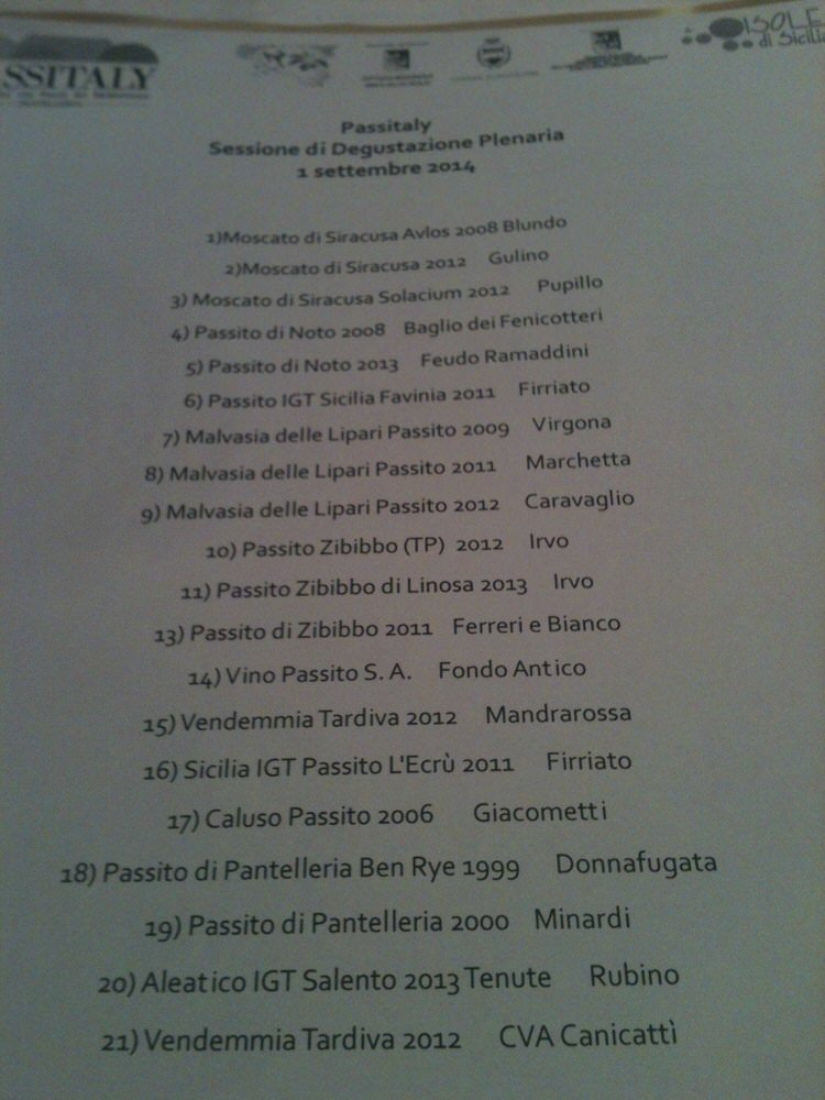 Altri vini italiani sono concorsi nei bicchieri dei giornalisti curiosi di sperimentare le diverse percezioni olfattive e di gusto, i Passiti di Linosa e del Trapanese, come la Vendemmia Tardiva, il Passito Sicilia IGT e un curiosissimo vino Passito prodotto da uva Grillo.