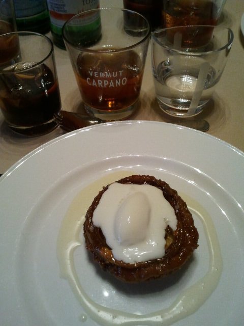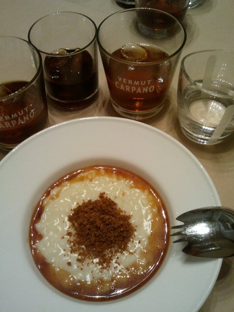 Si è proseguito con un piccolo risotto bianco all’acqua salata e pepe nero, affogato in una riduzione di Vermouth Carpano Antica Formula, cosparso di pane croccante e zest di limoni accompagnato da un bicchiere di Carpano Antica Formula in purezza on the rocks.
