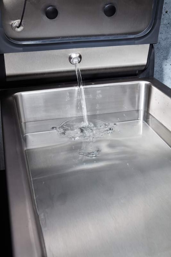 L’ingresso automatico dell’acqua consente inoltre di riempire la vasca premendo un solo pulsante, mentre lo scarico integrato ne permette lo svuotamento rapido e sicuro. Il collegamento diretto al sistema di drenaggio evita infine la necessità di canaline, mantenendo il pavimento asciutto e riducendo i rischi per gli operatori.