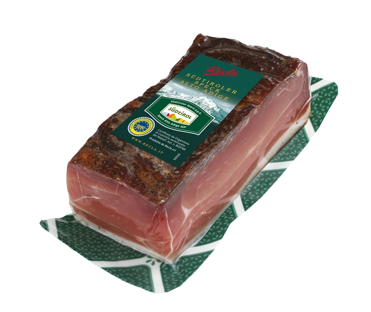 Lo Speck Alto Adige IGP di Recla rispetta rigorosamente i processi tradizionali ed è realizzato con le migliori cosce di suino attentamente selezionate. Per la speziatura viene ancora oggi utilizzata la ricetta segreta di famiglia, l’affumicatura con il legno di faggio è leggera e delicata, e la tipica stagionatura di minimo 22 settimane avviene all’aperto, dove l’aria fresca della Val Venosta garantisce un risultato eccezionale.