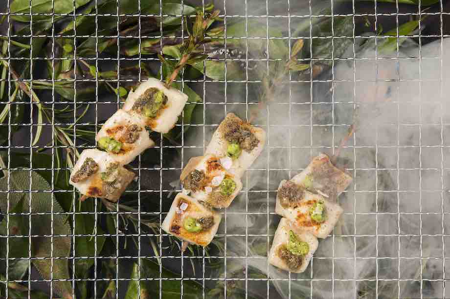 Scaldate una padella a fuoco medio/alto con un filo di Olio Evo, rosolate gli spiedini per circa un minuto per lato. Mettete gli arrosticini sopra a una griglia, facendoli affumicare per 5 minuti, aggiungete la polvere di capperi, una punta di salsa verde e il trito di acciughe e capperi per ogni cubo, terminate il piatto con un pizzico di Sale Maldon.