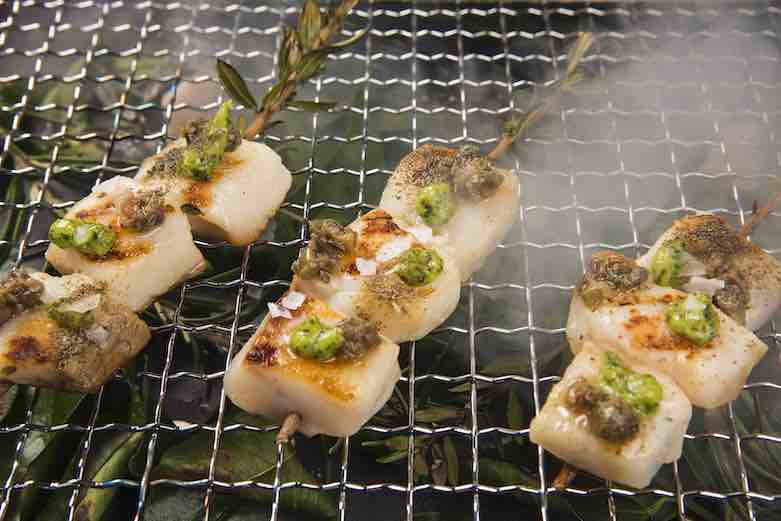 Scaldate una padella a fuoco medio/alto con un filo di Olio Evo, rosolate gli spiedini per circa un minuto per lato. Mettete gli arrosticini sopra a una griglia, facendoli affumicare per 5 minuti, aggiungete la polvere di capperi, una punta di salsa verde e il trito di acciughe e capperi per ogni cubo, terminate il piatto con un pizzico di Sale Maldon.