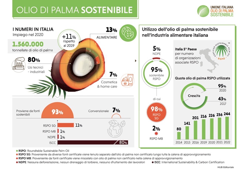 Nel 2020 il 95% dell’olio di palma utilizzato in Italia è certificato sostenibile e la domanda è in crescita, così come le richieste di certificazione. L’Italia, con 248 realtà associate a RSPO è al terzo posto in Europa ed al quinto nel mondo.