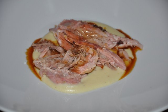 Crema al limone per sgrassare e pulire il palato e poi stinco di maiale cotto a bassa temperatura su crema di patate sifonate col suo ristretto (superbo).
