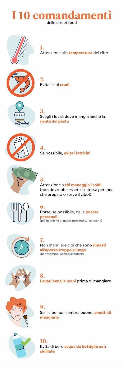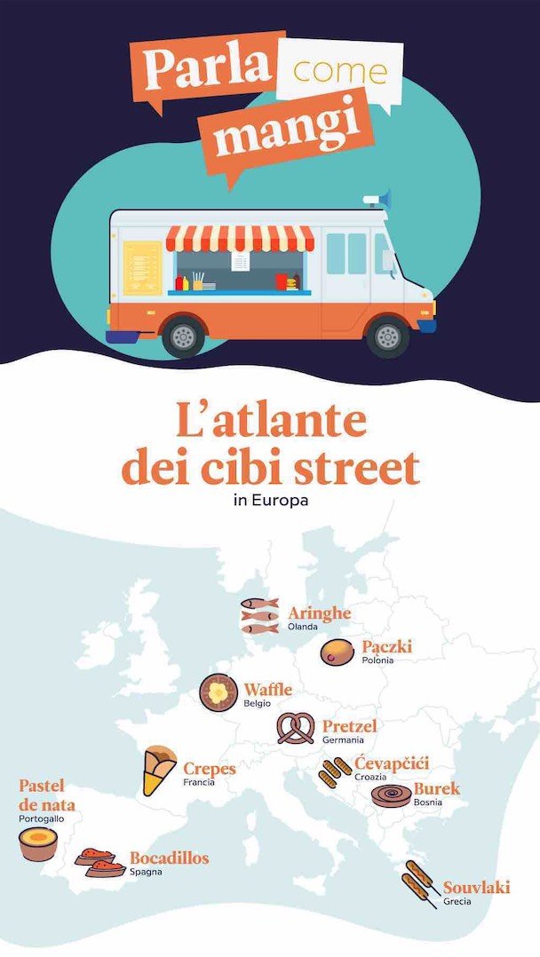 Nell’infografica (scarica pdf) si trovano poi diversi consigli per gustare questi cibi in totale sicurezza, e un frasario in diverse lingue straniere dedicato proprio allo street food, per ordinare i cibi nelle varie località europee non appena sarà possibile visitarle in piena tranquillità.