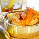 Particolari che fondono stili e luci, che creano atmosfere diverse per ogni angolo, ci accompagnano dall’ingresso alla seduta. Mise en plas semplice, come si addice ai più eleganti locali; ricercata nel gusto raffinato di accostamenti tra il bicchiere liscio e la coppa dell’acqua con rilievi barocchi, vasi di vetro sottili contengono piante di peperoncino colorate, lampade originali e lumi trovano posto ovunque e pile di casse di legno diventano service estemporanei.