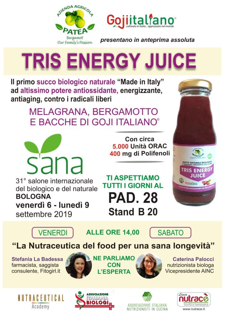 Presso lo stand dell’azienda Patea al SANA (B20/Pad.28) sarà possibile degustare il TRIS ENERGY JUICE ed altri succhi della salute. Inoltre, si parlerà de “La Nutraceutica del food per una sana longevità” insieme alla d.ssa Stefania La Badessa, alias Fitogirl, farmacista e saggista, Venerdì 6 settembre alle ore 14,00 e insieme alla biologa nutrizionista Caterina Palocci, vicepresidente AINC, Sabato 7 settembre alle ore 14,00.