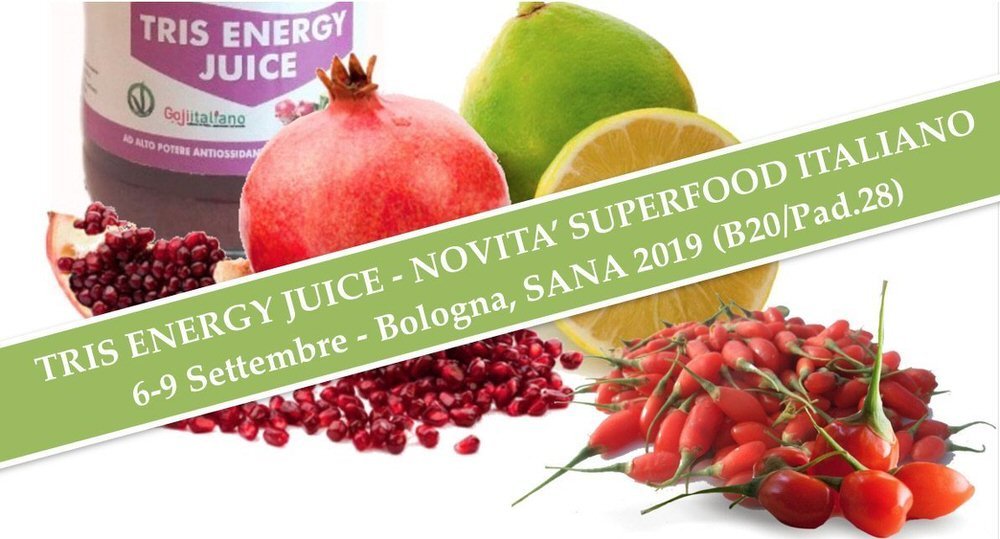 TRIS ENERGY JUICE – Novità a SANA 2019 supersucco bio e antiossidante a base di melograno, bergamotto e Goji Italiano