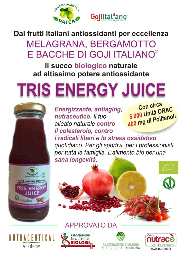 TRIS ENERGY JUICE – supersucco bio e antiossidante a base di melograno, bergamotto e Goji Italiano